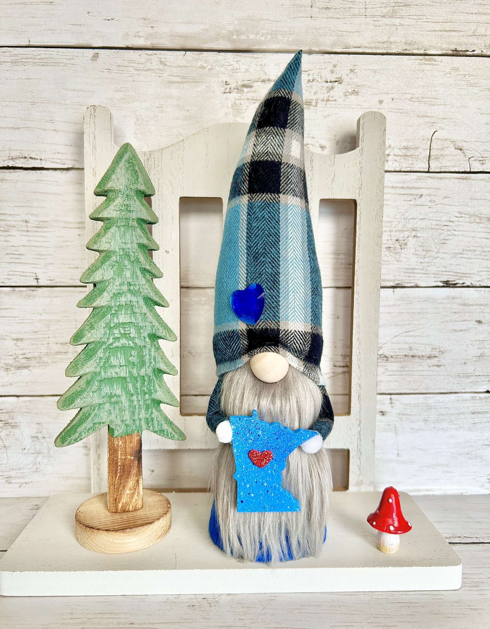This guy’s body is made of felt and foam and his hat is made of a very pretty blue plaid design, complete with blues, blacks and white colors. This guy comes holding a little mini wooden State of Minnesota in his hands.  What a super special and unique gift he would make!! You won’t find anything like him elsewhere!